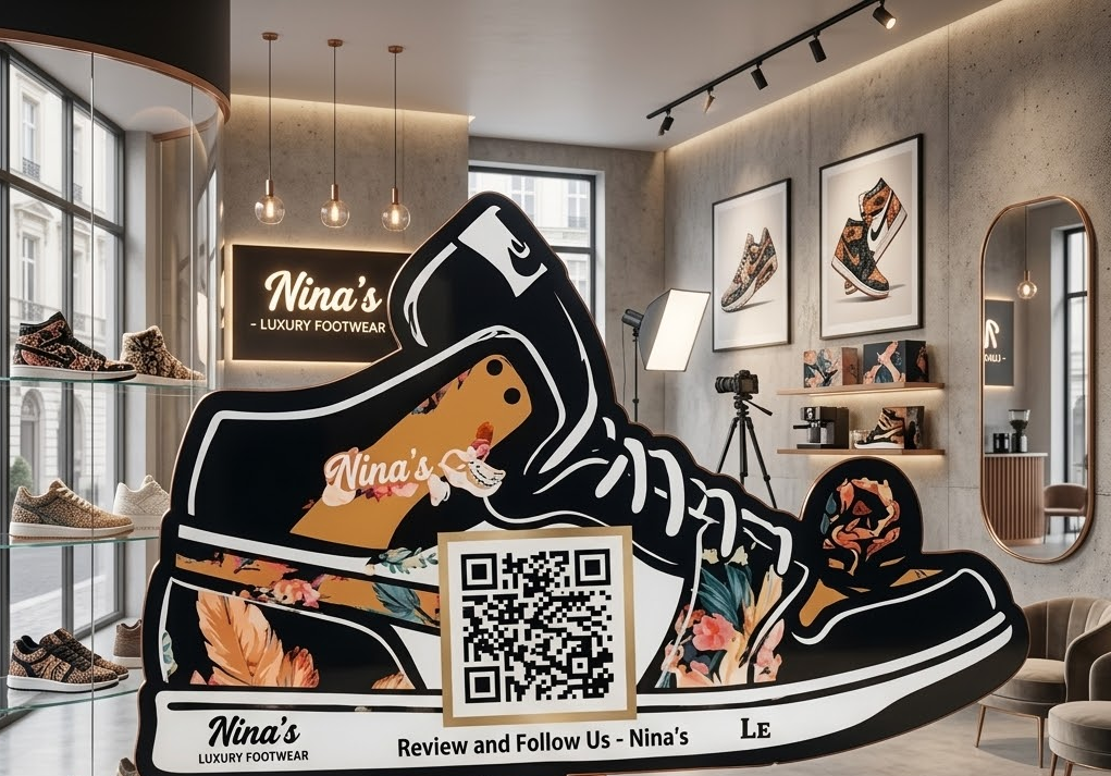 The 1 QR Standee in Shoes Design is a creative and attractive display designed especially for footwear stores and fashion promotions. Shaped like a stylish shoe, it captures attention instantly while featuring a single QR code for quick and easy scanning. Customers can scan the code to access product collections, special offers, websites, or social media pages. Made with durable materials and high-quality printing, this standee is lightweight, easy to place, and perfect for shoe shops, retail stores, exhibitions, and promotional counters. 👟📱✨